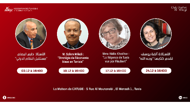 Programme des conférences du mois de décembre 2021, chaque vendredi à 16 heures, à la Maison de l'ATUGE , 5 rue Moutanabbi - Menzah 1.
